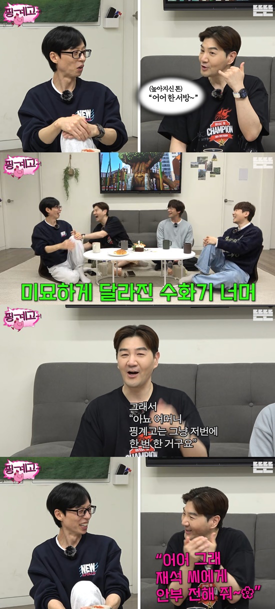 이어 한상진은 달라진 장모님의 대우를 자랑했다. 그는 "장모님이 해운대 임 여사님이다. 단아하고 우아하시다. 전화하면 우아하게 말씀하시는데 '핑계고' 나가고 나서 전화받으시녀 '유재석씨하고 있나'하고 하시더라"라며 "주변에 친구들과 계신거 같더라"라고 했다.