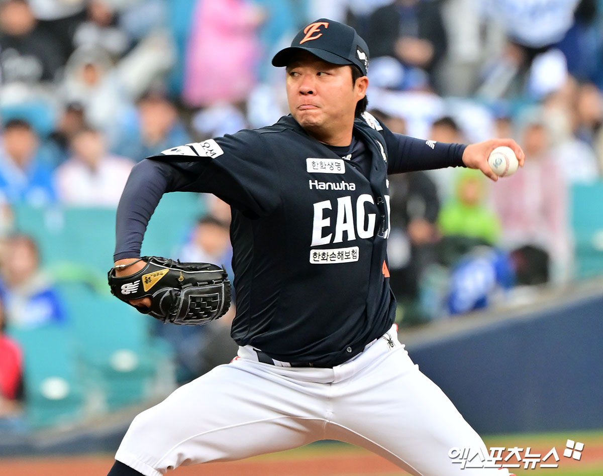 (엑스포츠뉴스 대구, 김한준 기자) 5일 오후 대구삼성라이온즈파크에서 열린 '2025 신한 SOL Bank KBO리그' 한화 이글스와 삼성 라이온즈의 경기, 8회말 한화 김범수가 공을 힘차게 던지고 있다.