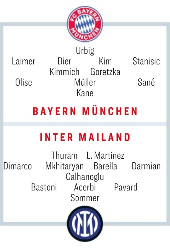 현재 알폰소 데이비스, 다요 우파메카노, 이토 히로키, 자말 무시알라는 부상으로 인해 시즌 아웃이 사실상 확정된 상태이다. 마누엘 노이어, 알렉산다르 파블로비치, 킹슬리 코망도 인터밀란전을 앞두고 출전할 수 있을지 의심되고 있다.