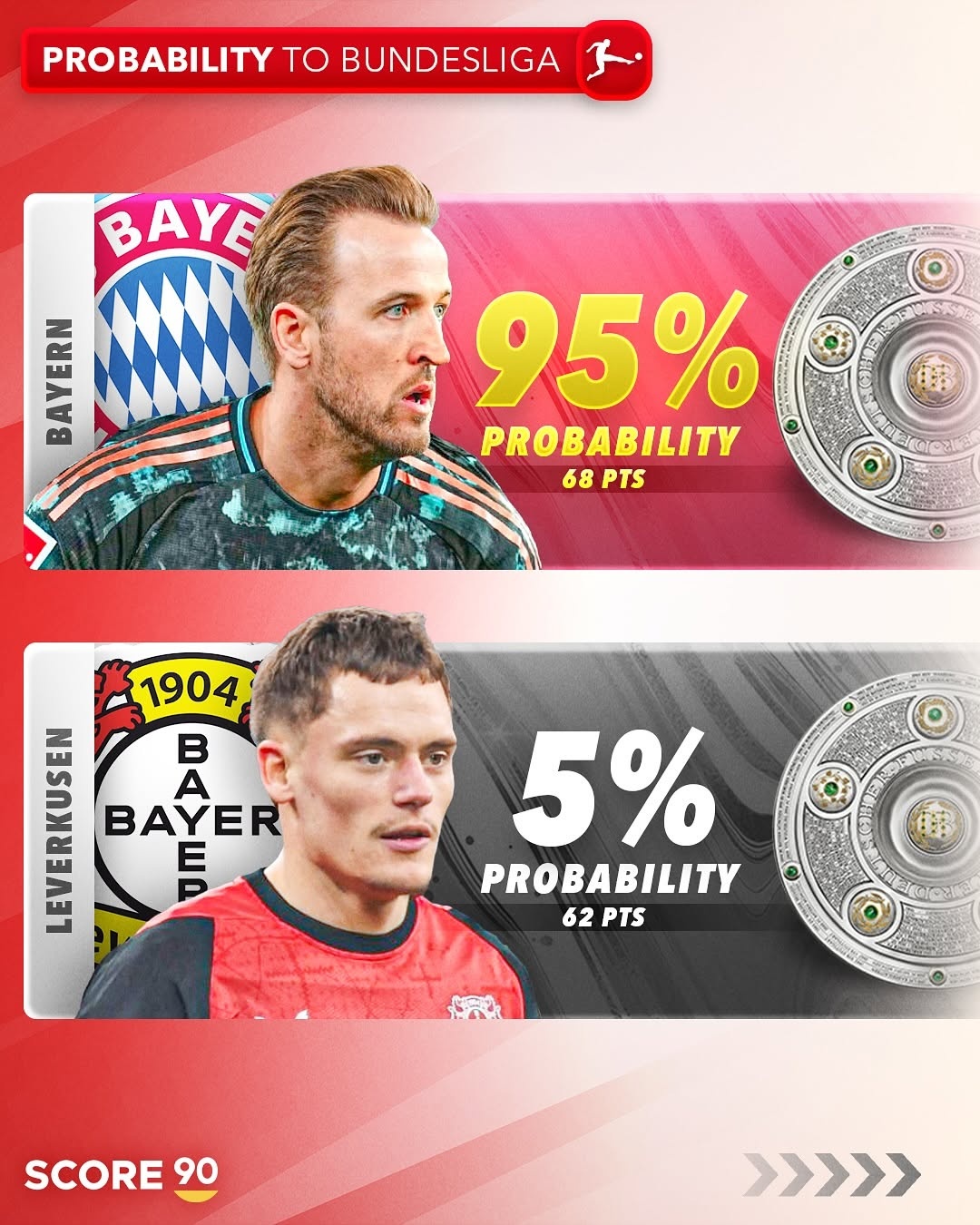 그러나 '스코어90'은 뮌헨이 레버쿠젠에 역전 우승을 허용할 가능성은 단 5%에 불과하다고 예상했다. 뮌헨이 우승을 차지할 확률을 95%로 내다본 것이다.
