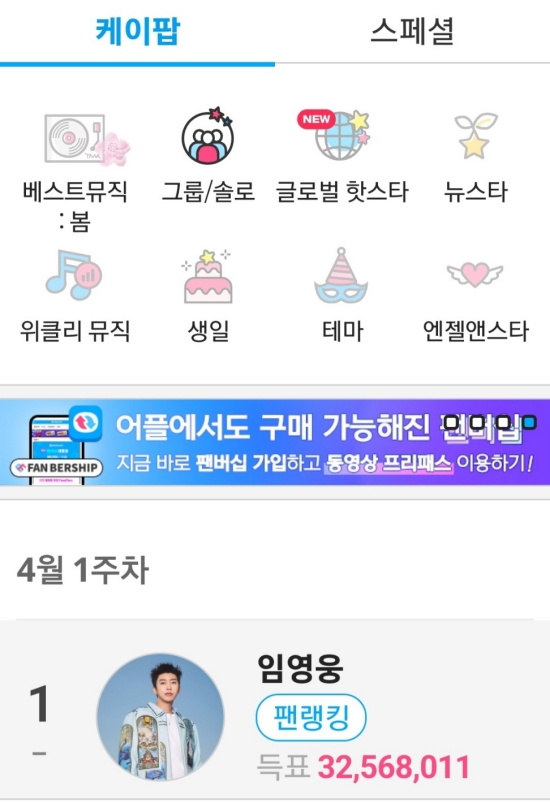 최근 '팬앤스타'에 따르면, 임영웅은 4월 1주 차 솔로가수 인기 랭킹 투표에서 1위에 등극했다.
