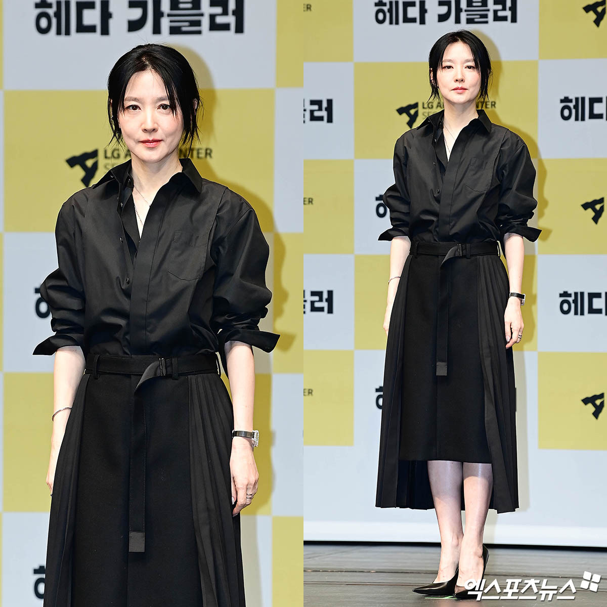 8일 서울 LG아트센터 서울에서 진행된 연극 '헤다 가블러' 제작발표회에 참석한 이영애는 블랙 셔츠와 롱 플리츠 스커트를 매치한 클래식한 스타일로 등장했다.