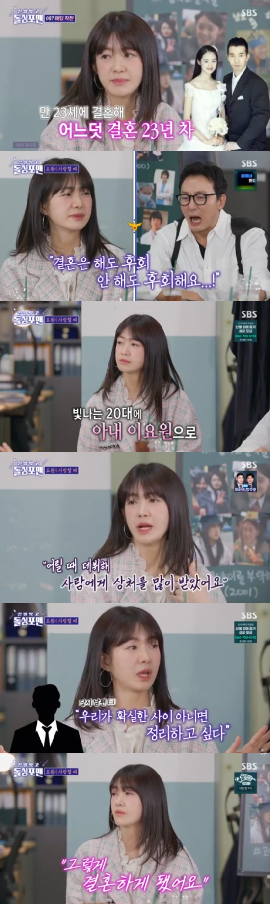 이요원은 어린 나이에 남편과 결혼을 결심한 계기에 대해 "결혼은 해도 후회, 안 해도 후회인 것 같다. 저도 결혼까지 할 생각은 없었다. 제가 일찍 데뷔를 해서 사람들에 상처를 많이 받았다. 사람에 질렸었다. 그 때 만난 사람이 남편이다. 타이밍이 그렇게 됐다"고 설명했다.