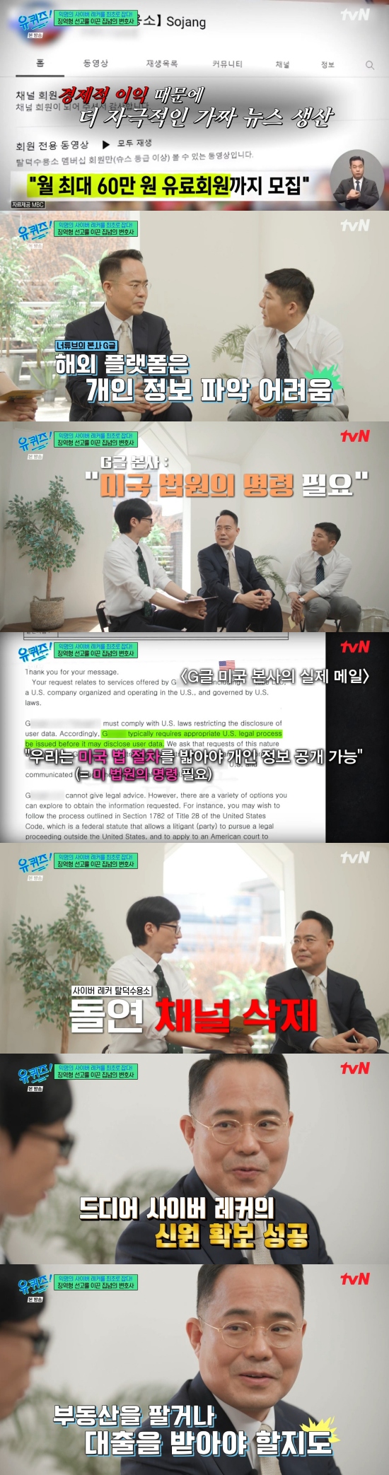 이날 유재석은 "운영자를 잡으려면 (구글) 미국 본사의 협조가 필요한 거 아니냐"라며 물었고, 정경석 변호사는 "반드시 필요하다. 국내 지사들이 다 있으니까 국내 지사에 법원을 통해서 요청을 보내면 '서비스 주체가 아니다. 정보에 대한 접근 권한이 없다. 그러니까 미국 본사로 연락해 보시길 바란다'라고 한다. 여러 가지 노력을 하다가 미국 본사로 메일을 보내서 회신을 받긴 했다. 기본적으로는 미국 법원의 명령이 있어야 (신원 정보를) 줄 수 있다는 거다"라며 밝혔다.