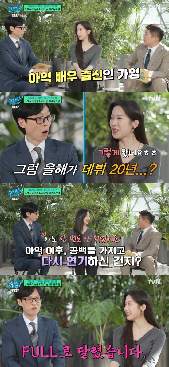 유재석은 "올해 데뷔 20년이 되신 거냐"라며 감탄했고, 문가영은 "그렇게 됐다"라며 밝혔다. 조세호는 "공백을 가지시고 (연기를) 다시 하신 거냐"라며 궁금해했고, 문가영은 "사실 한 번도 안 쉬었다. 풀로 달렸다"라며 전했다.