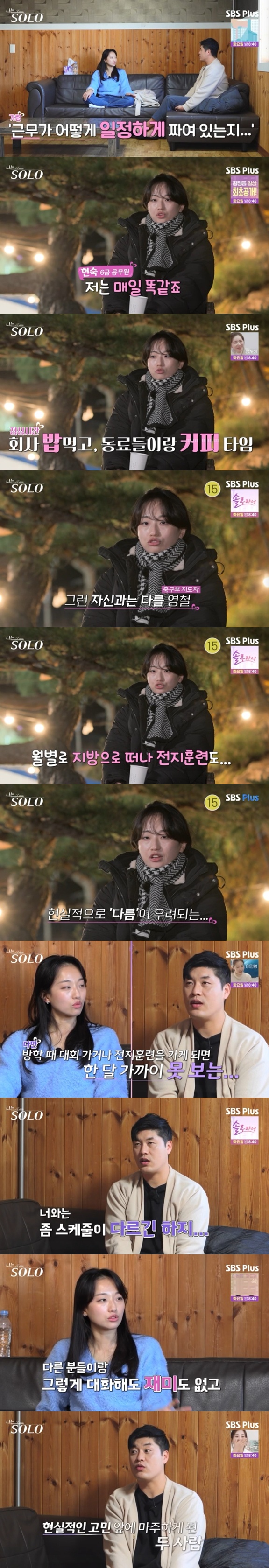 제작진과의 인터뷰에서는 "난 매일 똑같다. 9시 출근해서 6시에 퇴근하고 점심 시간 일정하고 회사 밥 먹고 동료들과 시간을 보낸다. 영철님은 근무 시간도 조금 다르고 월별로 전지훈련을 가는 시즌도 있다고 하고 얼핏 들었지만 계약이 종료되면 아니면 끝나기 전에 더 좋은 자리를 찾아 나갈 수도 있다고 하는데 난 그게 아니지 않냐. 그게 굉장히 다른 점이라고 느꼈다"라고 고백했다.