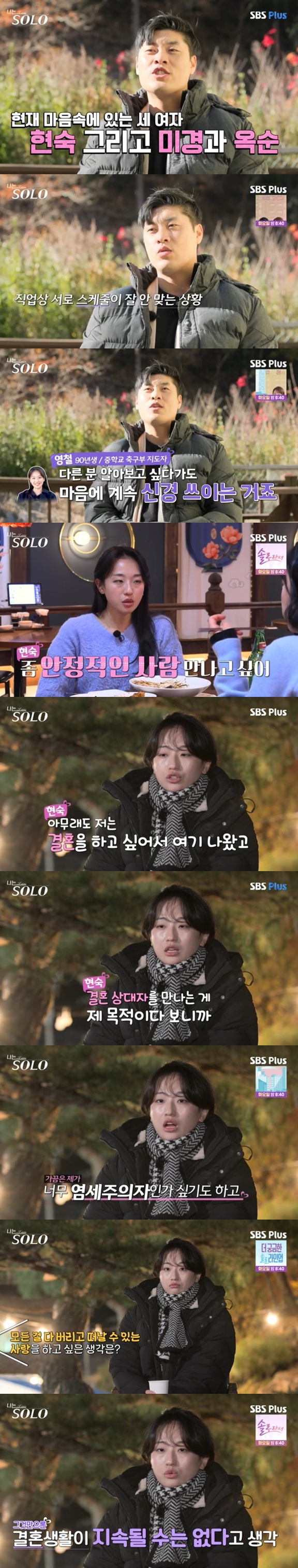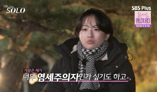9일 방송한 ENA·SBS Plus 리얼 데이팅 프로그램 ‘나는 SOLO’에서 25기 현숙은 옥순에게 "영철님을 사회에서 보면 내가 매력적이라고 느낄 수 있을까"라고 털어놓았다.