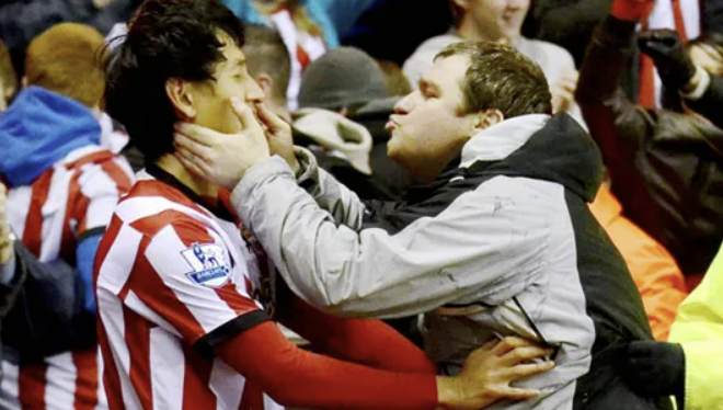 지동원은 왼쪽 코너로 이동해 동료 선수, 홈팬들과 기쁨을 나눴는데 한 남성이 뒤에서 나타나 팔로 지동원의 목을 감싼 뒤 키스를 시도해 이후에도 두고두고 화제가 됐다.