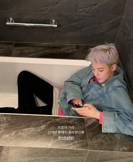 10일 지드래곤 부계정에는 "피로야 가라. 신개념 후레쉬 에어 반신욕"이라는 글과 함께 근황을 담은 사진이 게재됐다.
