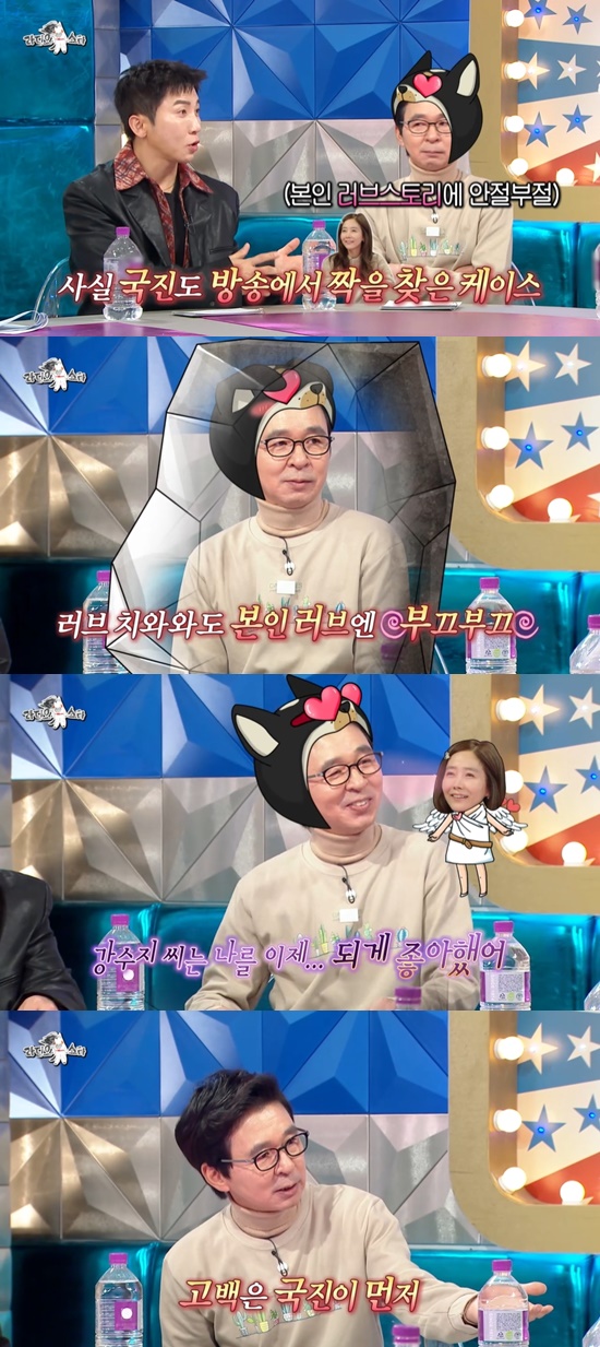유세윤은 "국진이 형도 방송에서 만나서 비슷한 계기로 사랑을 확인한 경우"라고 말했고, 김구라도 "강수지 씨가 적극적으로 한 거다. 맞지 않나. 과정은 모르지만 방송에서 보여지길 강수지 씨가 적극적이었다"고 거들었다.