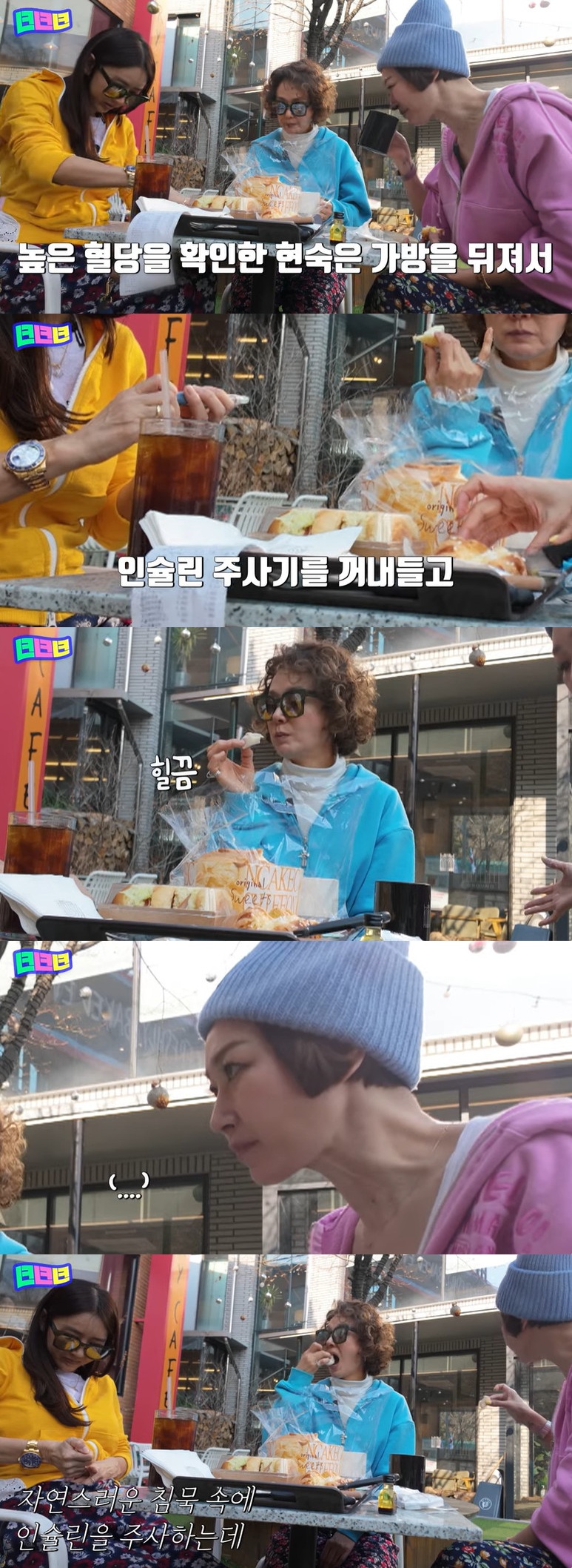 배종옥은 "잘 버티고 있나 봐봐"라고 걱정했고, 낮았으면 좋겠다는 바람과 달리 155로 높은 혈당이 나오자 윤현숙은 가방 속에서 인슐린 주사기를 찾아 꺼냈다.