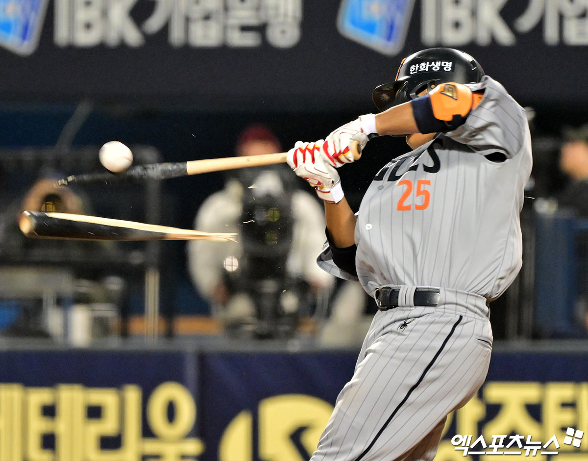 (엑스포츠뉴스 잠실, 김한준 기자) 10일 오후 서울 송파구 잠실야구장에서 열린 '2025 신한 SOL Bank KBO리그' 한화 이글스와 두산 베어스의 경기, 4회초 2사 2루 한화 김태연이 타격을 하고 있다. 결과는 3루수 플라이 아웃.