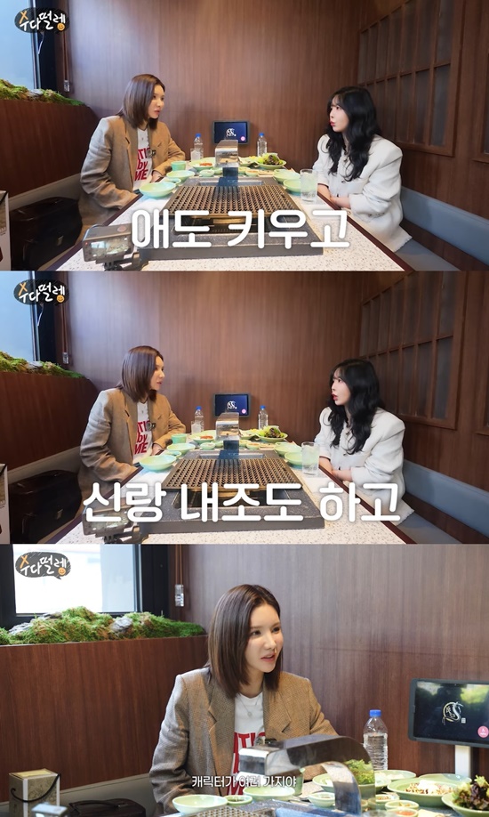 정아는 근황을 묻는 말에 "사업한 지 2년 됐다. 계속 사업하고 있고, 오늘도 오전에 일하고 왔다. 애도 키우고 신랑 내조도 한다. 캐릭터가 여러가지다"라며 웃었다.