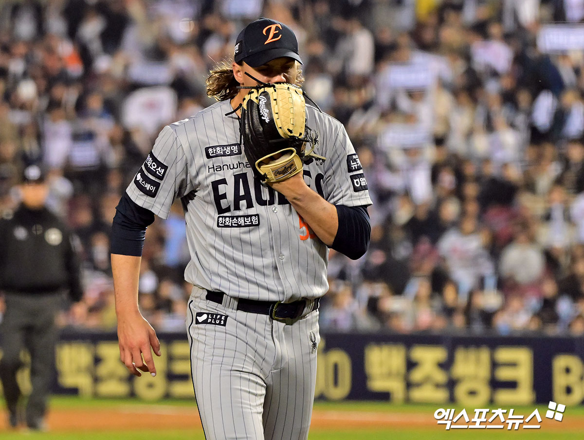 (엑스포츠뉴스 잠실, 김한준 기자) 10일 오후 서울 송파구 잠실야구장에서 열린 '2025 신한 SOL Bank KBO리그' 한화 이글스와 두산 베어스의 경기, 8회말 2사 한화 와이스가 마운드를 내려오고 있다.