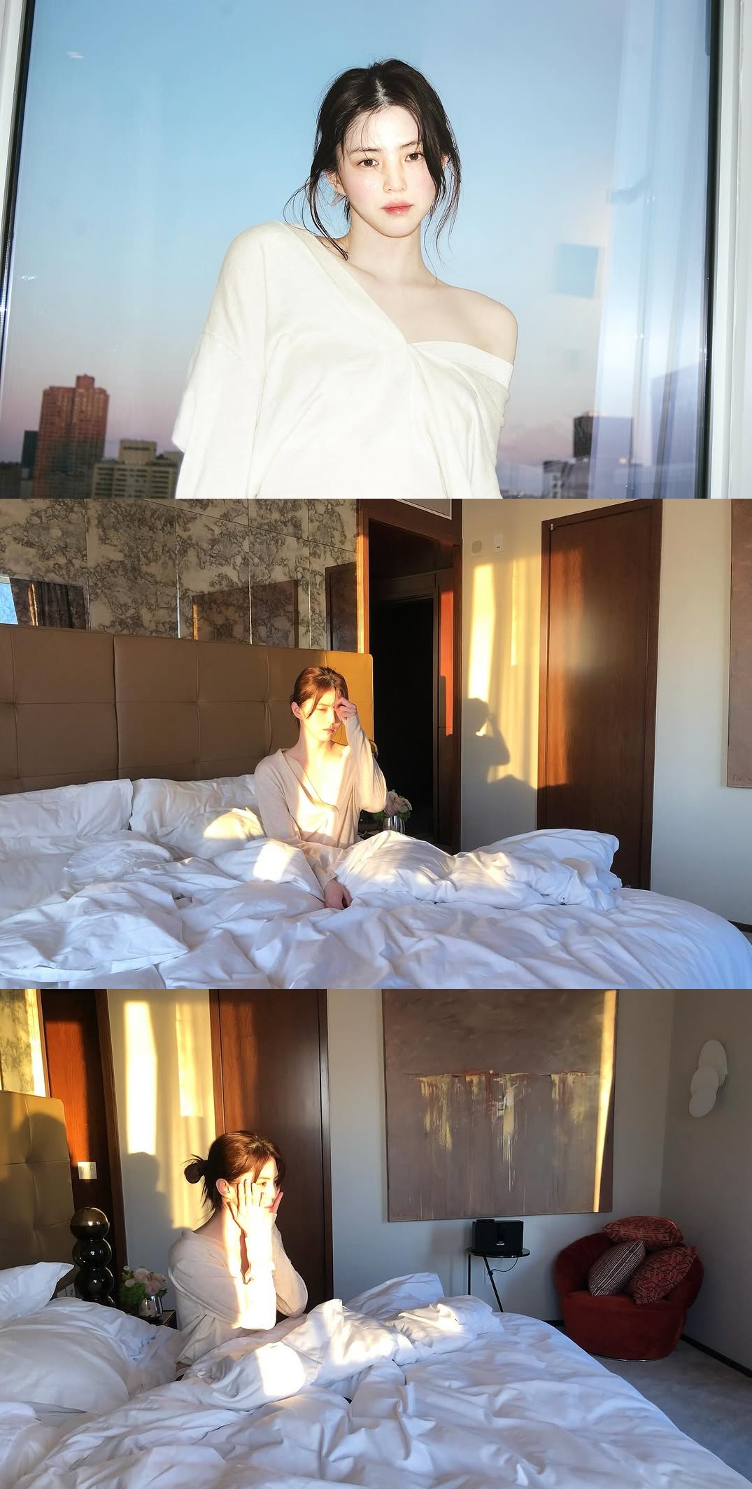 공개된 사진 속 한소희는 전망이 좋은 호텔에서 포즈를 취하고 있어 눈길을 끈다.