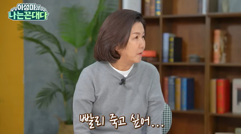 이성미는 "삶에 재미가 없다. 빨리 죽고 싶다. 삶의 의욕이 없다. 옛날에 암에 걸렸을 때 '나 이제 죽는구나. 너무 좋다' 싶었다"며 "요새도 '이 긴 세상 뭐 이렇게 오래 사는 게 좋냐. 가고 싶다'고 생각한다"고 말했다.