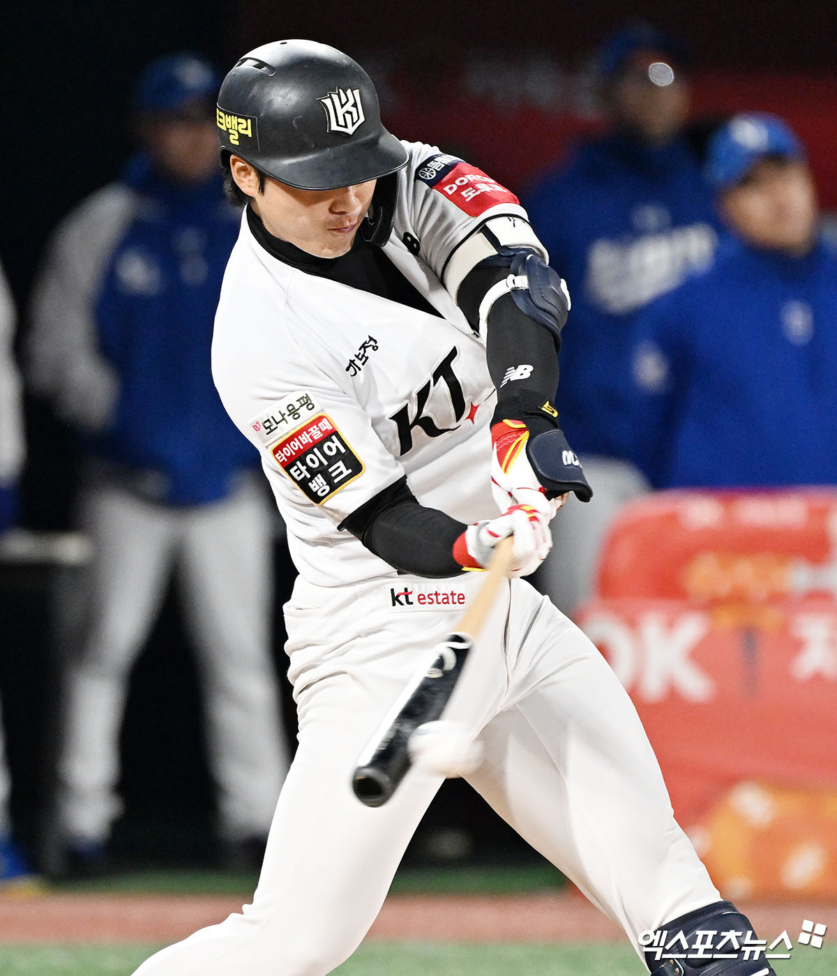 (엑스포츠뉴스 수원, 김한준 기자) 11일 오후 수원KT위즈파크에서 열린 '2025 신한 SOL Bank KBO리그' 삼성 라이온즈와 KT 위즈의 경기, 4회말 1사 2루 KT 장준원이 1타점 적시타를 날리고 있다.