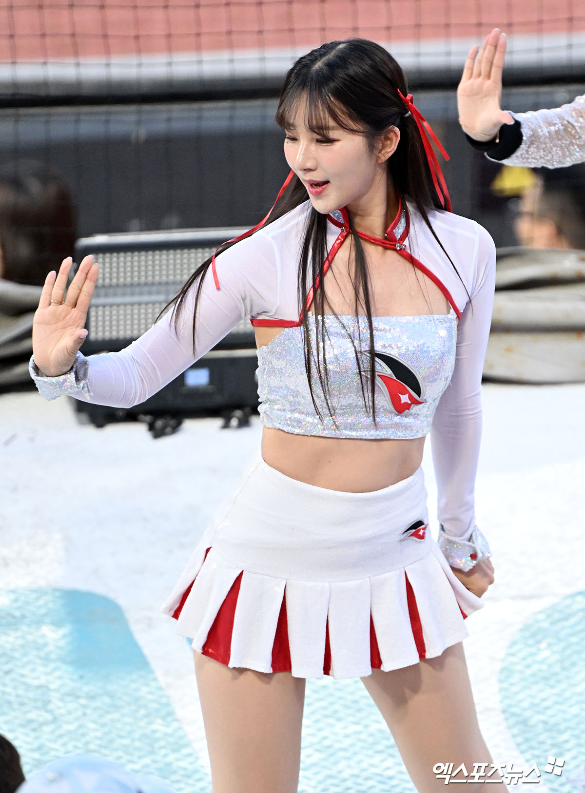 (엑스포츠뉴스 수원, 김한준 기자) 11일 오후 수원KT위즈파크에서 열린 '2025 신한 SOL Bank KBO리그' 삼성 라이온즈와 KT 위즈의 경기, 김진아 치어리더가 멋진 공연을 선보이고 있다.