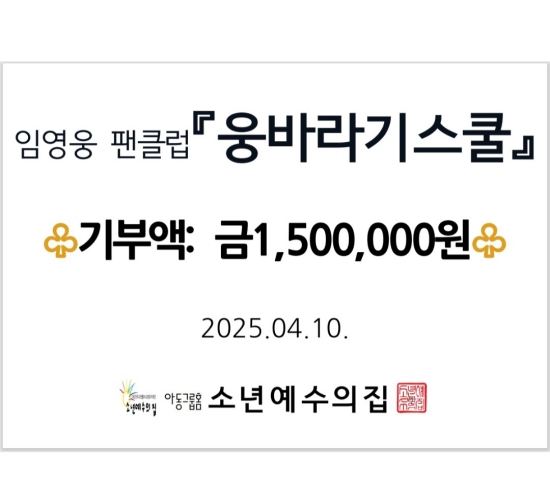 최근 임영웅 팬클럽 '잠실 웅바라기스쿨'은 송파구 소년예수의 집에 150만 원의 정기후원금을 전달했다고 밝혔다.