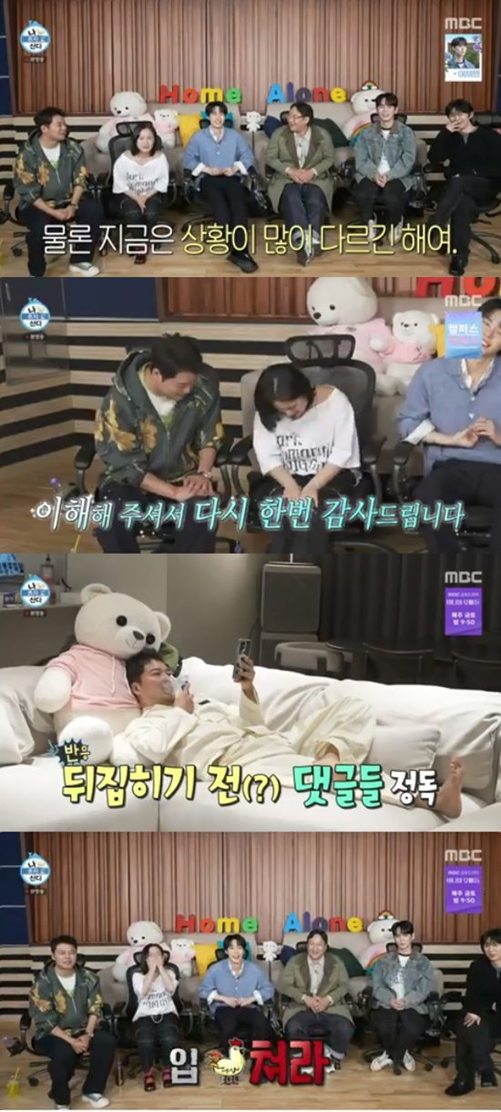 전현무는 목이 아픈 와중에도 소파에 누워서 자신을 응원해주는 SNS 댓글들을 확인했다.