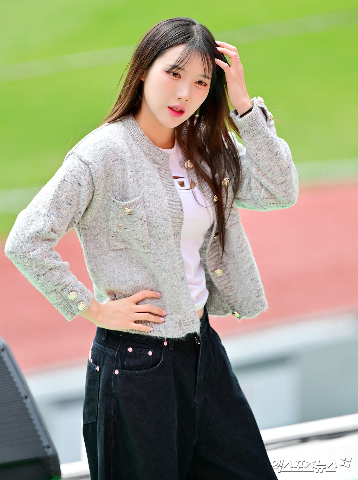 (엑스포츠뉴스 잠실, 김한준 기자) 12일 오후 서울 송파구 잠실야구장에서 열리는 '2025 신한 SOL Bank KBO리그' 두산 베어스와 LG 트윈스의 경기, 이진 치어리더가 리허설에 임하고 있다.