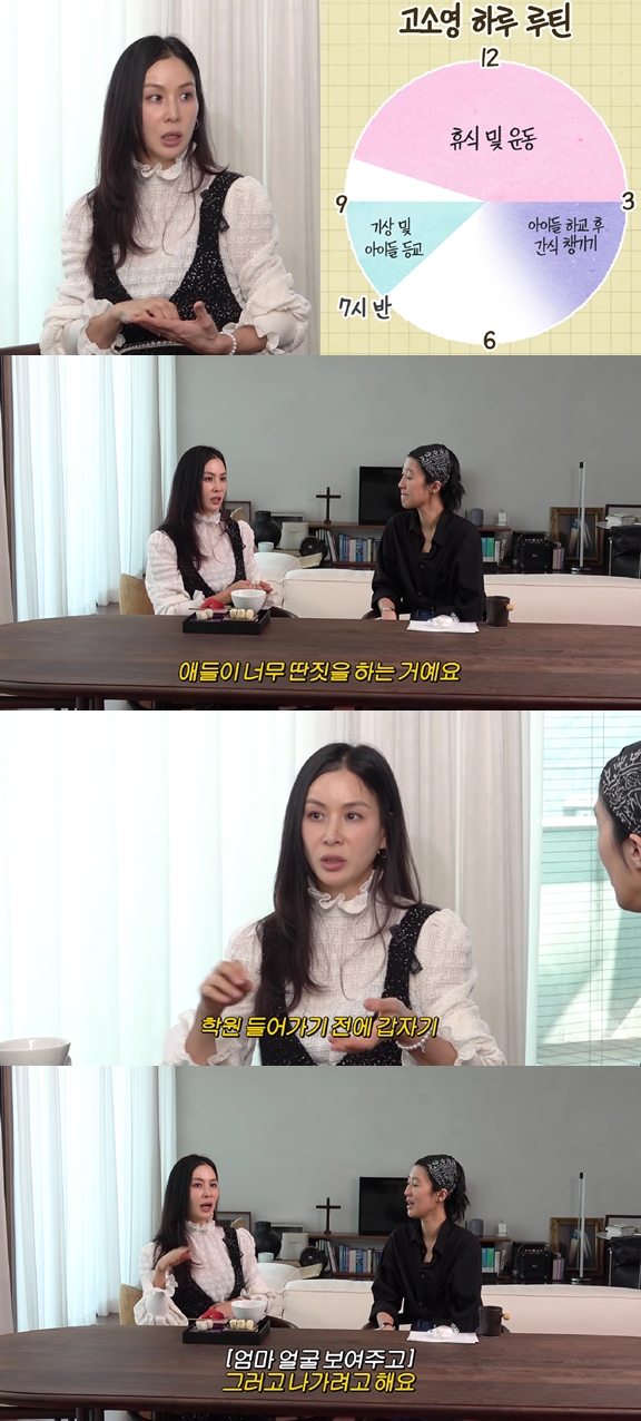 영상에서 고소영은 일상 루틴을 공개하며 "굉장히 단순하다. 7시 반 일어나서 아이들 학교 보내고, 조금 쉬다가 운동가거나 산책가거나. 아이들이 3시 되면 온다. 그럼 간식 챙겨 준다"라고 설명했다.