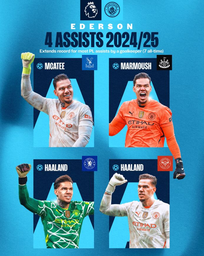 에데르송은 현재까지 프리미어리그 통산 7개의 어시스트를 기록 중이며, 이는 같은 포지션 선수들 중 최다 기록이다. 특히 전설적인 골키퍼 피터 슈마이켈, 팀 하워드, 유씨 야스켈라이넨, 마크 크로슬리 등도 3개 이하에 머물고 있는 점을 고려하면, 이 기록은 당분간 깨지기 어려울 것으로 보인다.