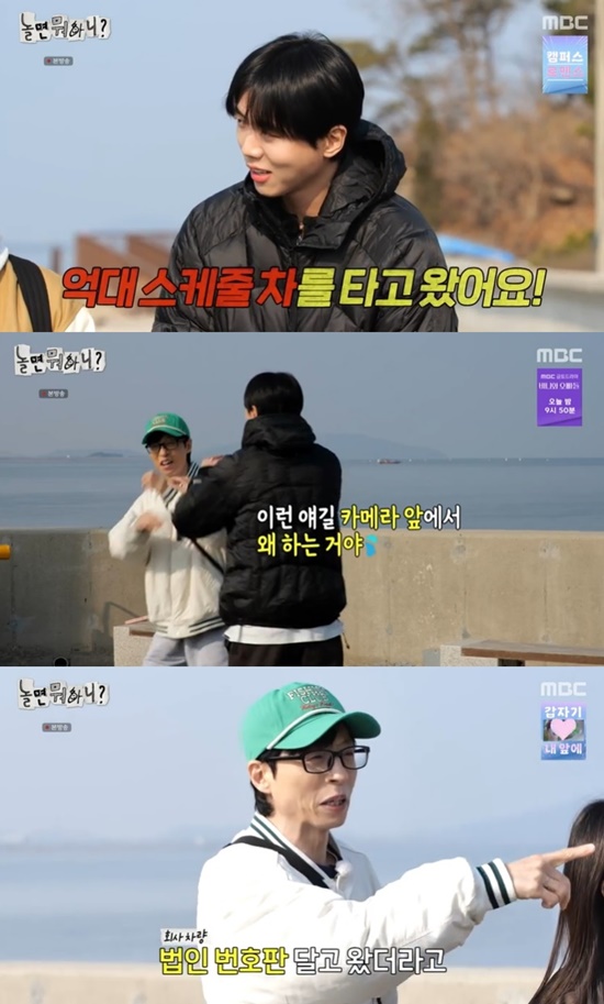 당황하는 주우재에게 유재석은 "좋은 차를 타고 왔더라. 회사 차가 법인 번호판을 달고 왔다. (내가 봤던) 스케줄 차 TOP3 안에 든다"고 말했다.