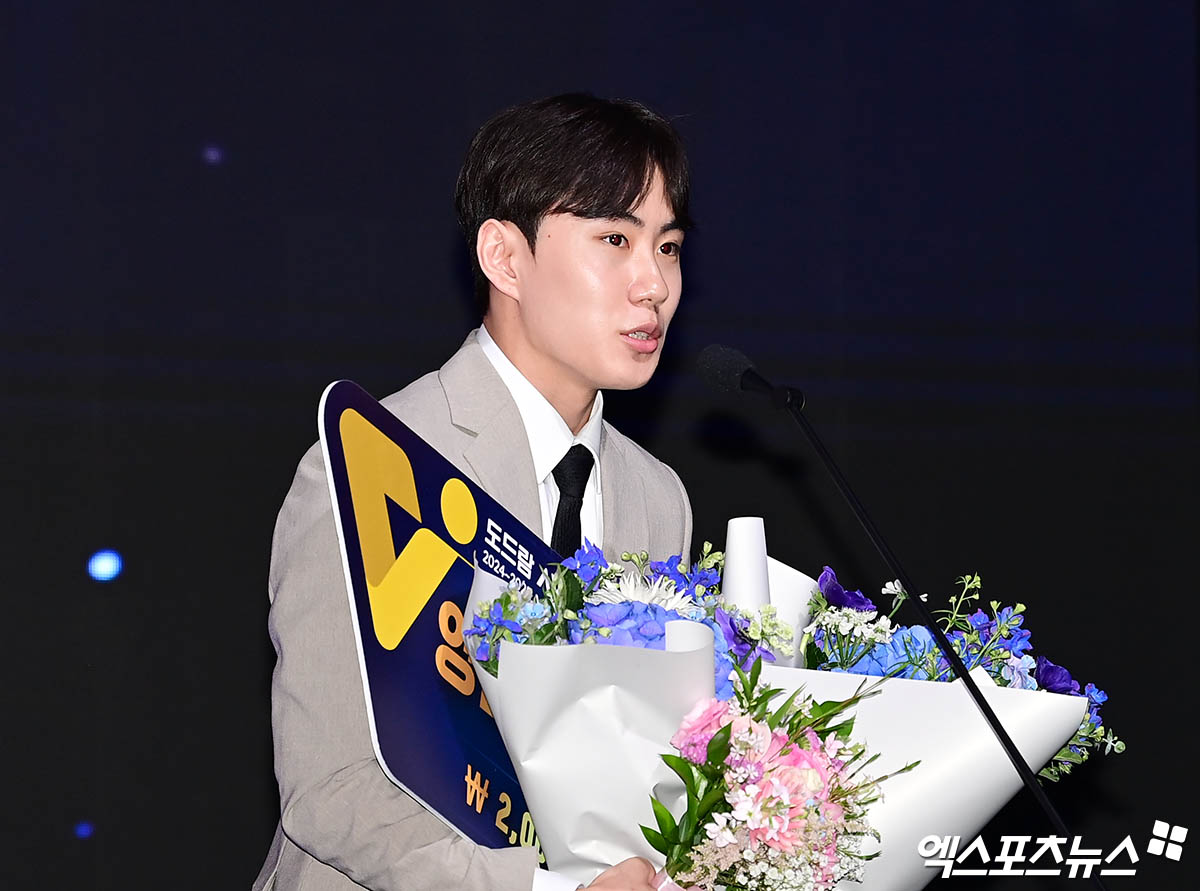 (엑스포츠뉴스 박지영 기자) 14일 오후 서울 홍은동 스위스 그랜드 호텔에서 열린 '2024~2025 도드람 V-리그 시상식'에 참석한 우리카드 한태준이 남자부 영플레이어상 수상 소감을 전하고 있다.