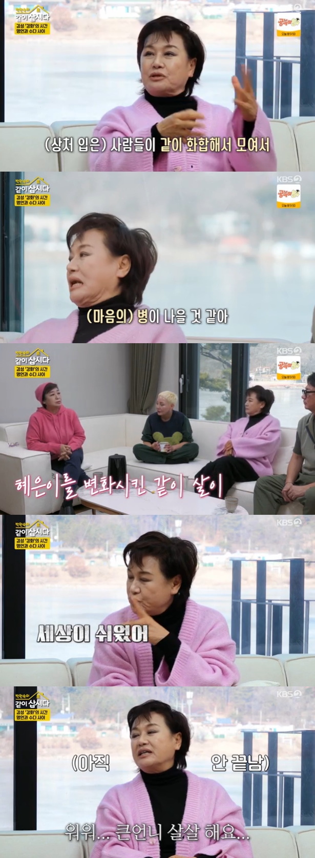 이어서 박원숙은 "상처를 받은 여러 사람들이 여러 프로그램들을 같이 하게 되면 병이 나을 것 같아. 혜은이를 보면"이라며 '같이 삽시다'를 하며 달라진 혜은이의 모습에 대해 이야기했다.