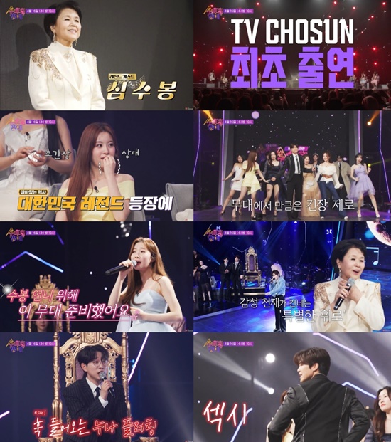 가요계 레전드 심수봉이 첫 회 게스트로 출연을 예고한 것. 무엇보다 심수봉은 그간 TV조선 프로그램에서 한 번도 만나본 적 없는 인물이기에, 그녀의 등장만으로도 예비 시청자들의 시선이 한 곳에 쏠리고 있다.
