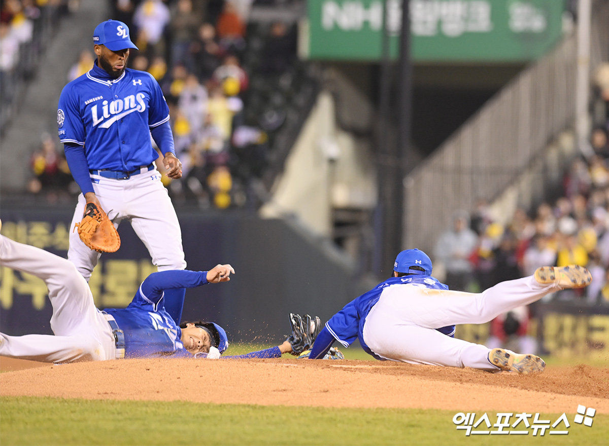 (엑스포츠뉴스 잠실, 고아라 기자) 15일 오후 서울 송파구 잠실야구장에서 열린 '2025 신한 SOL Bank KBO리그' 삼성 라이온즈와 LG 트윈스의 경기, 6회말 2사 1,2루 삼성 이재현이 LG 박동원을 뜬공을 처리하고 있다.