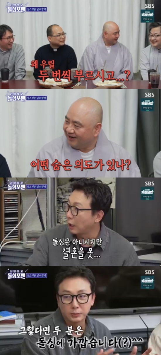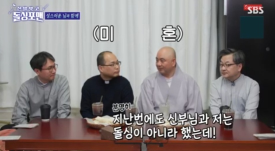 15일 방송된 SBS 예능 프로그램 '신발 벗고 돌싱포맨'에서는 김진 목사, 성진 스님, 하성용 신부, 박세웅 교무가 출연해 이야기를 나눴다.
