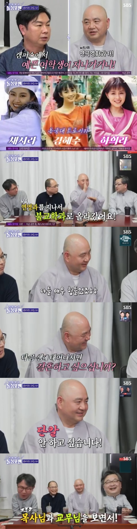 탁재훈은 "불교는 다음 생이 있지 않냐. 다음 생에는 결혼을 하고 싶으시냐"고 물었고, 스님은 "안 하고 싶다"고 딱 잘라 말했다. 이어 성진 스님은 "(결혼을 한) 목사님과 교무님을 보면서 신부님이랑 둘이 '우리가 잘했지?'라고 얘기를 한다"고 덧붙여 웃음을 줬다.
