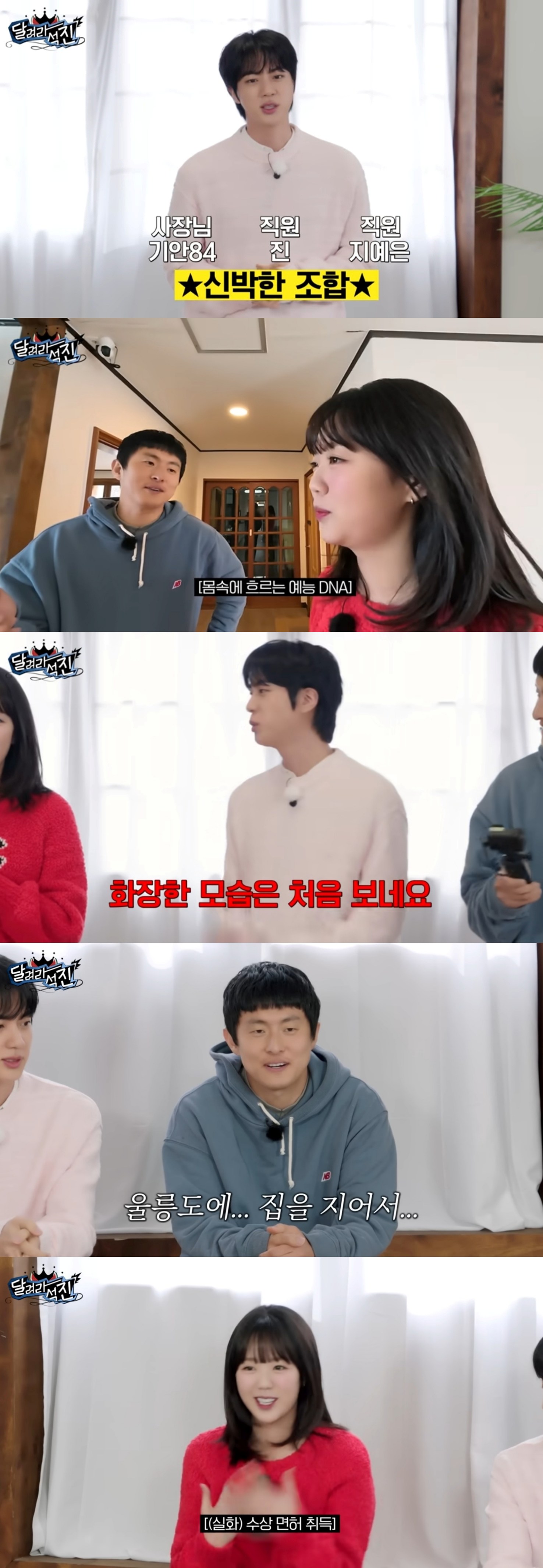 이날 제작진은 지난 8일부터 넷플릭스에서 순차공개되고 있는 예능 '대환장 기안장'을 언급했다. 그러자 진은 "저희도 슬슬 넷플릭스에 진출도 하고 여러 가지로 진출을 해야 앞으로도 승승장구하고 그러는 거 아니겠습니까"라고 야망을 드러냈다.