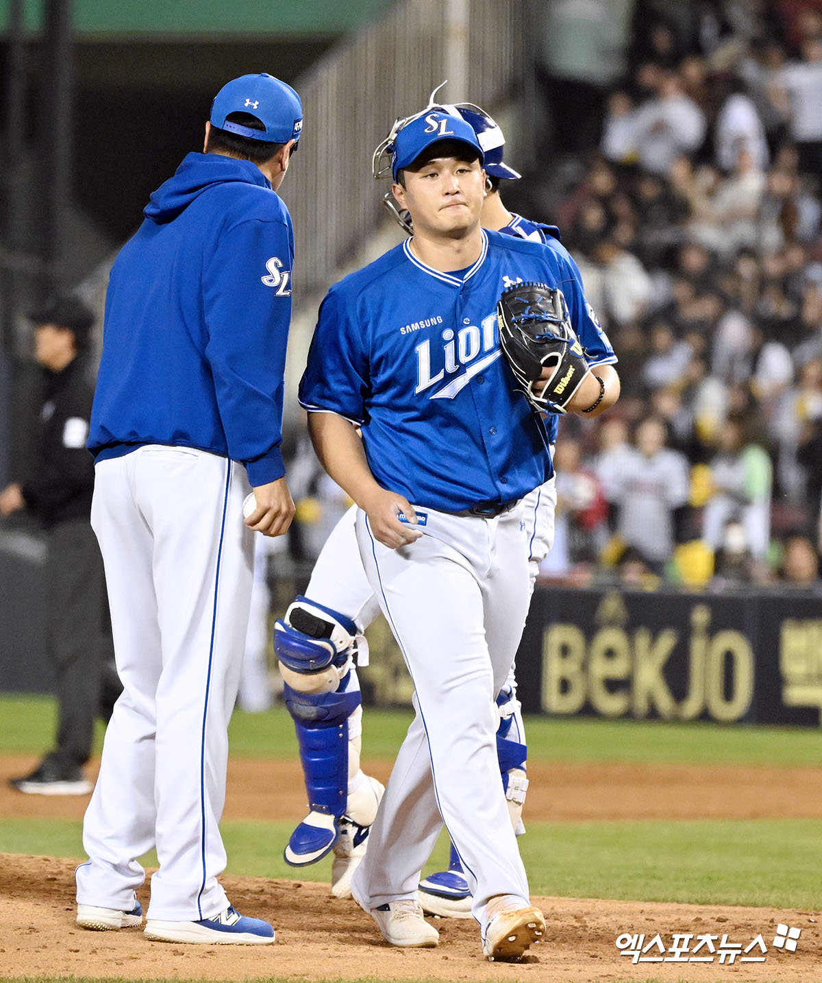 (엑스포츠뉴스 잠실, 김한준 기자) 16일 오후 서울 송파구 잠실야구장에서 열린 '2025 신한 SOL Bank KBO리그' 삼성 라이온즈와 LG 트윈스의 경기, 4회말 1사 1,2루 삼성 최원태가 마운드를 내려오고 있다.