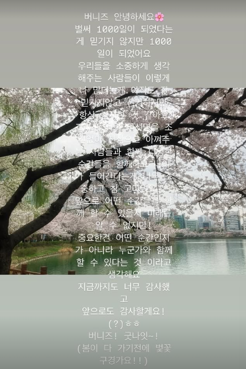 이어 그는 "앞으로 어떤 순간들을 함께할 수 있을지 미래를 알 수 없지만! 중요한 건 어떤 순간인지가 아니라 누군가와 함께할 수 있다는 것이라고 생각해요. 지금까지도 너무 감사했고 앞으로도 감사할게요! 버니즈 굿나잇~! (봄이 다 가기 전에 벚꽃 구경 가요!)"이라고 덧붙이며 글을 마무리했다.