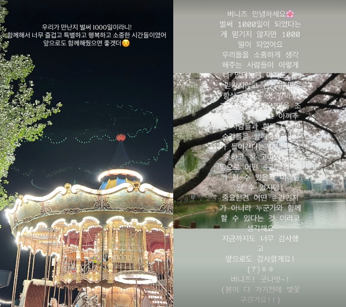 네 번째 멤버는 "버니즈와 1000일, 멤버들 그리고 버니즈 모두 축하해요! 너무너무 고맙고 같이 응원해줘서 정말 힘이 많이 된다. 버니즈들도 가끔은 마음을 가볍게 비우고 기분 좋아지는 풍경을 눈에 담았으면 한다. 고마워요!", 자정 직전 나타난 마지막 멤버는 "버니즈 안녕하세요. 벌써 1000일이 되었다는 게 믿기지 않지만 1000일이 되었어요. 우리들을 소중하게 생각해주는 사람들이 이렇게나 많다는 게 아직도 잘 믿기지 않고 신기하지만 항상 감사한 것 같아요. 그리고 저희 다섯 명을 조건 없이 진심으로 아껴주는 사람들과 함께 다양한 순간들을 함께하고 나이가 들어간다는 게 너무 소중하고 참 고마워요"라고 전했다.