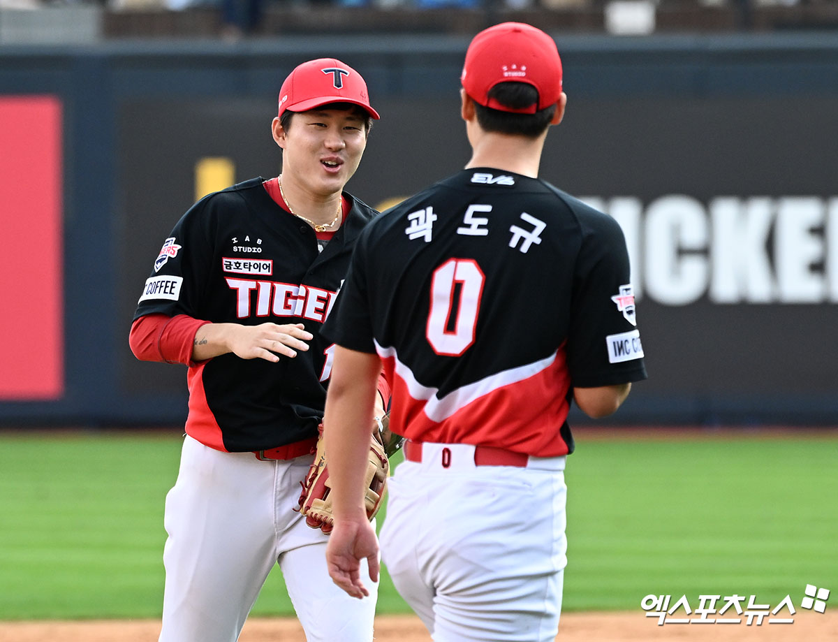 사령탑과 최원준은 16일 경기를 앞두고 꽤나 긴 시간 동안 그라운드 위에서 이야기를 나누기도 했다. 최원준은 여러 차례 타격 자세를 취하면서 이범호 감독에게 조언을 구했다. 두 사람 사이에서 어떤 이야기가 오갔을까.