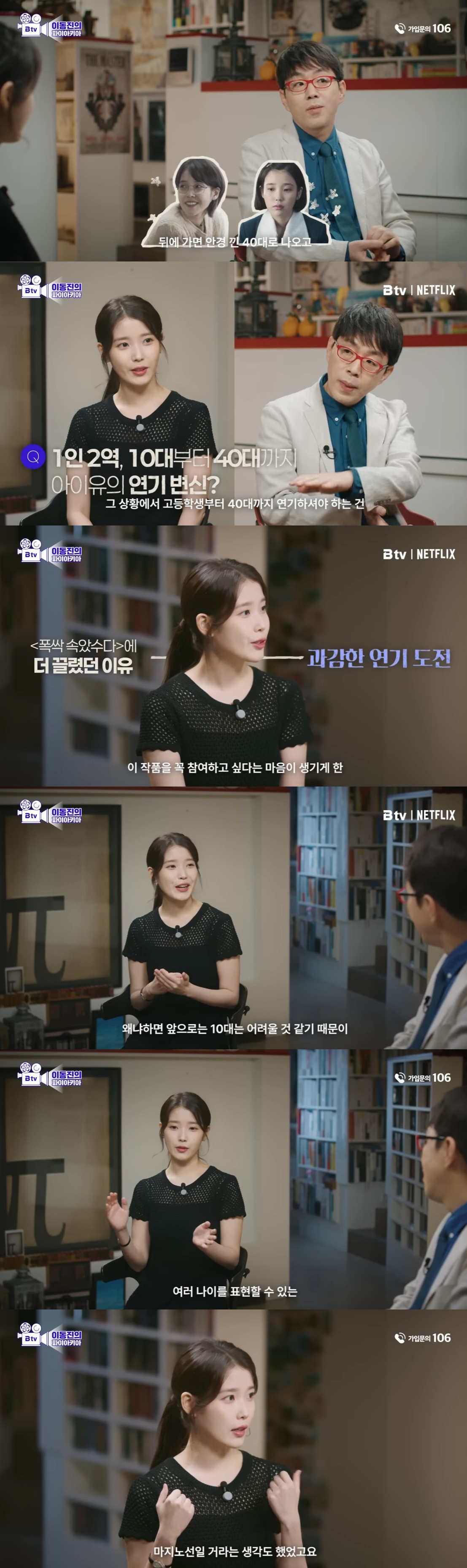 "이전에 배역을 이렇게까지 폭넓게 해본 적이 없지 않나"라는 질문에도 아이유는 "그렇다. 앞으로도 어렵지 않을까. 앞으로는 10대(연기)는 어려울 거 같다. 저도 지금 나이가 여러 나이대를 표현할 수 있는 마지노선이란 생각도 했다. 그래서 욕심이 났다"고도 덧붙였다.