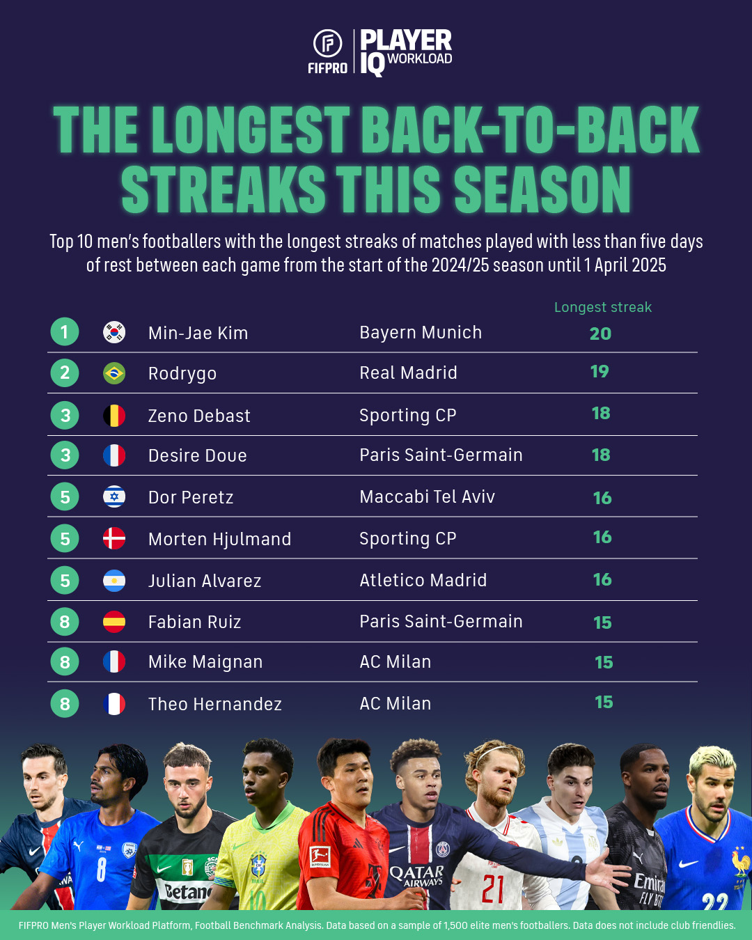 FIFPro의 발표에 따르면, 김민재는 겨울을 지나오면서 무려 20경기 연속 출장했다. 이는 평균 3.7일만 쉬고 계속 경기를 치르는 셈이다. 단 10주 만에 시즌의 절반가량을 소화한 셈이다.