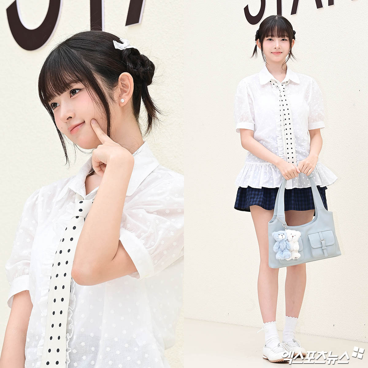 셔츠 밑단의 러플 디테일은 사랑스러운 분위기를 강조했고, 네이비 체크 미니스커트는 단정함과 발랄함을 동시에 살렸다.