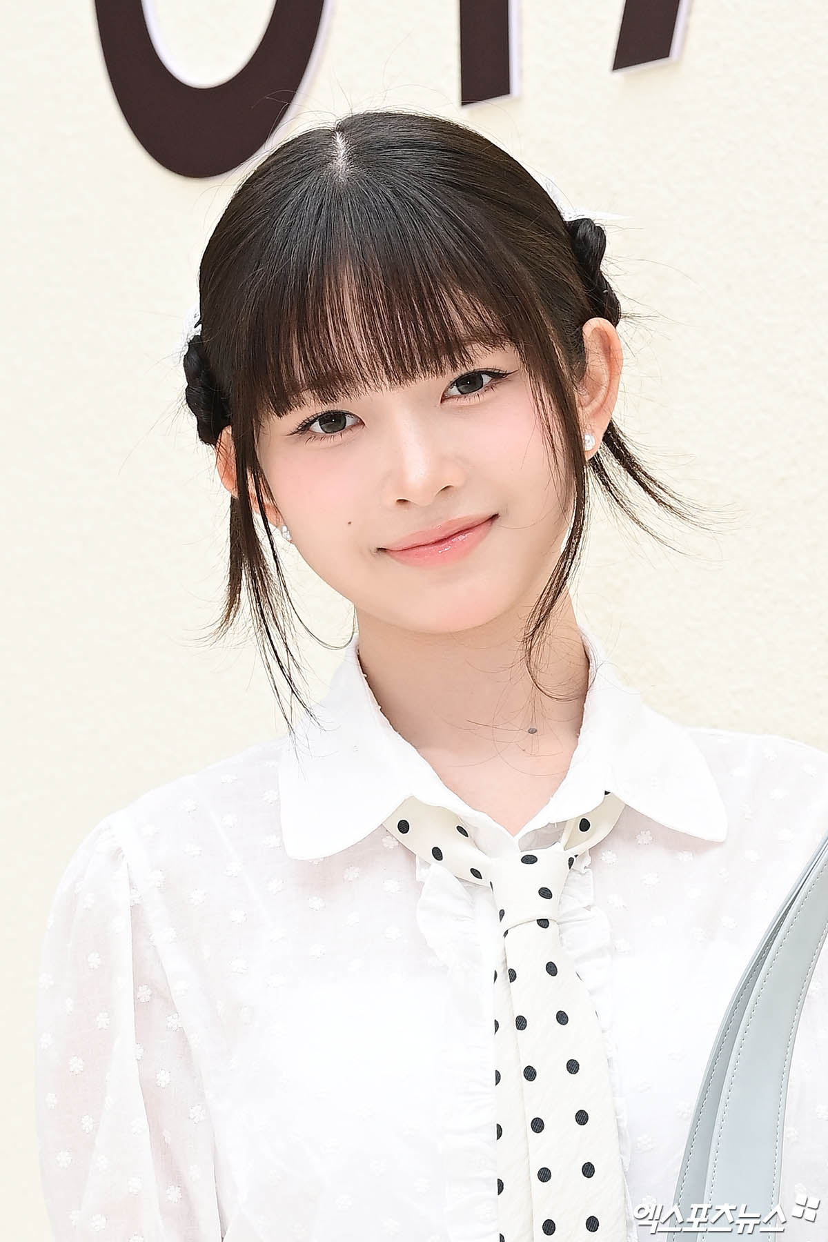 헤어는 두 갈래로 말아올린 깔끔한 업스타일에 리본 장식을 더해 귀엽고 단아한 이미지를 배가시켰다.