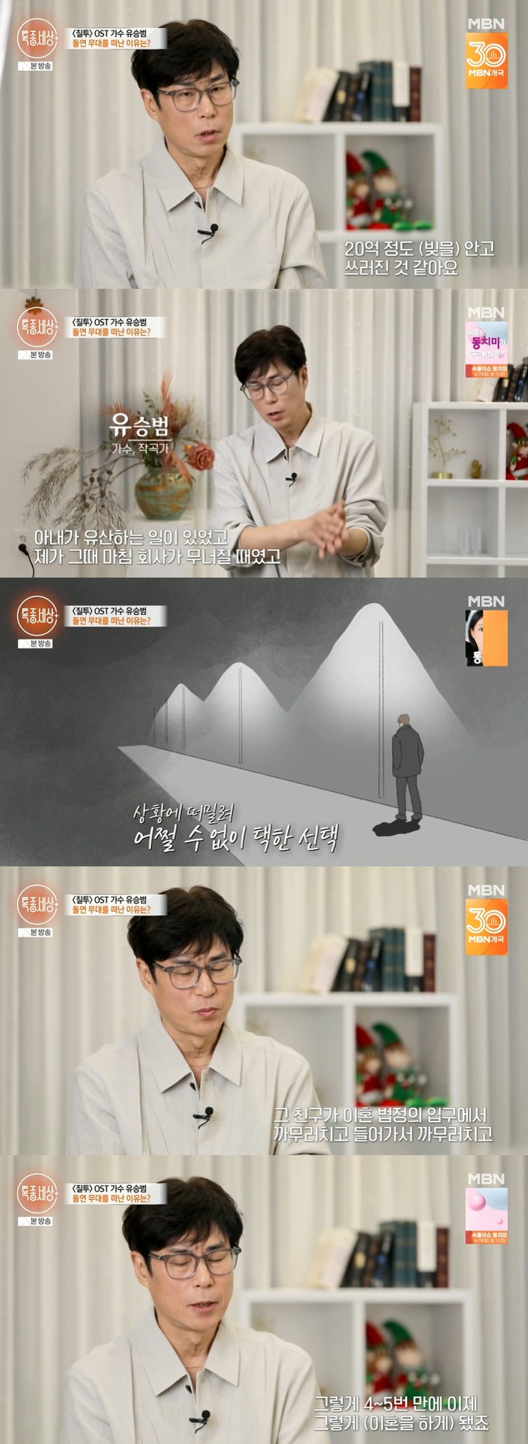 유승범은 당시 상황을 회상하며 "모든 이별은 슬프고, 모든 이혼은 가슴이 찢어진다. 그 친구가 이혼 법정 입구에서 까무러치고, 들어가서 까무러치고... 그렇게 4~5번 만에 이제 그렇게 (이혼을 하게) 됐다"며 힘들었던 심정을 밝혔다.