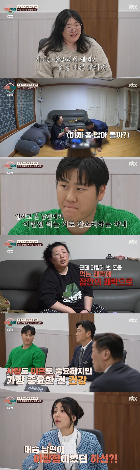 아내는 "잔소리가 아니라 답답해서 말하는 거다. 그게 잔소리가 되냐"고 자신의 모습을 부정했다. 뿐만 아니라 먹는 걸로도 잔소리하는 모습을 보였고, 이후 남편은 아내 몰래 음식을 먹기도 했다.