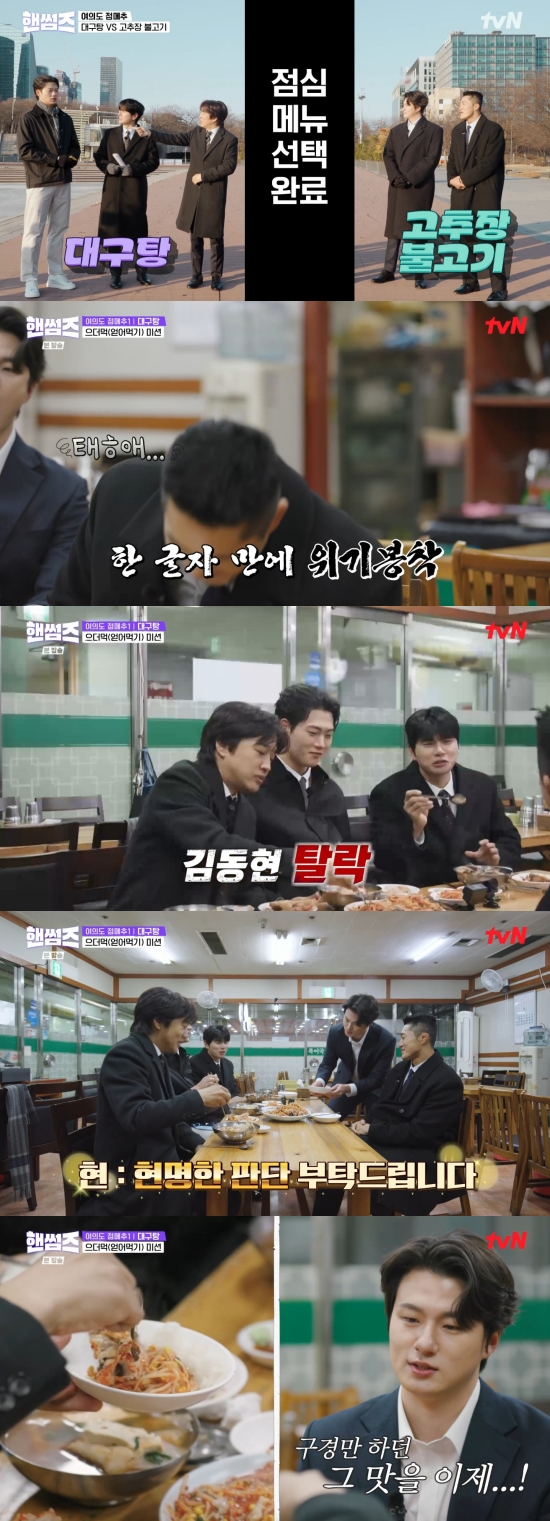 이후 멤버들은 김동현이 추천한 고추장 불고기와 이이경이 추천한 대구탕 중 하나를 선택해 점심 식사를 하러 갔다. 김동현과 신승호는 고추장 불고기를 골랐고, 차태현, 이이경, 오상욱은 대구탕을 골랐다.