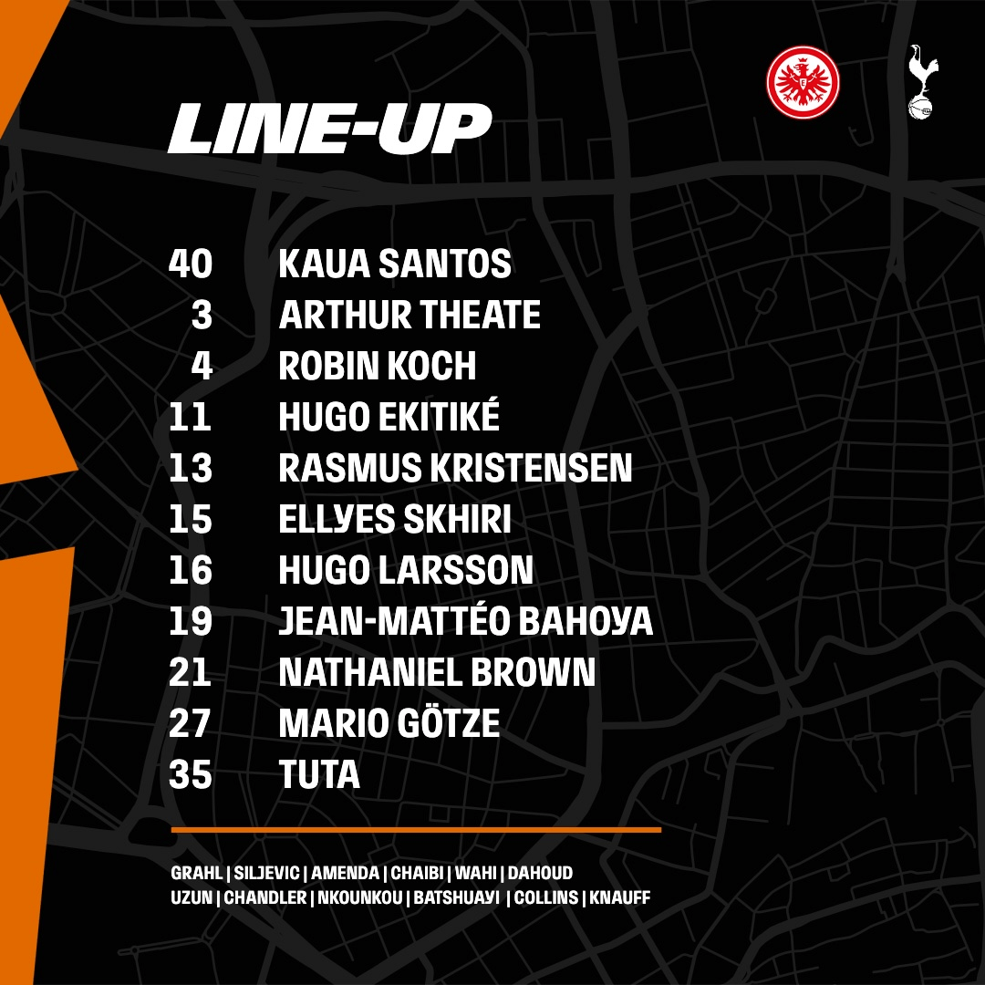 프랑크푸르트는 4-2-3-1 전형으로 나섰다. 카우아 산토스 골키퍼가 장갑을 꼈고 라스무스 크리스텐센, 투타, 로빈 코흐, 아르투르 테아트가 수비를 구축했다. 3선은 엘리스 스키리, 위고 라르손이 나와 수비를 보호했다. 2선은 나다니엘 브라운, 마리오 괴체, 장마테오 바호야, 최전방에 위고 에키티케가 출격했다.