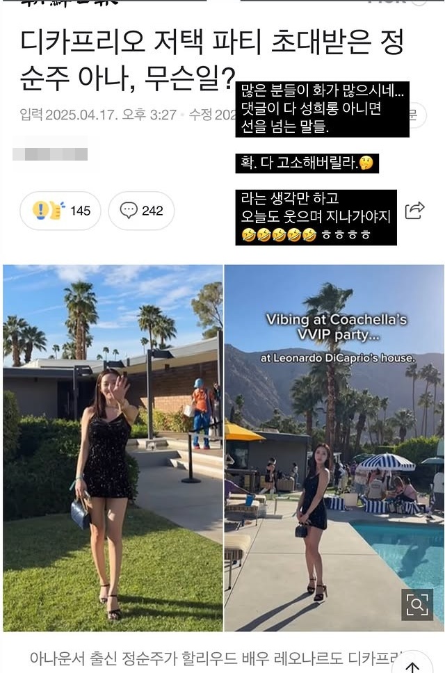 16일 정순주는 "레오나르도 디카프리오 집에서 열린 코첼라 VVIP 하우스 파티", "는 내가 레오나르도 디카프리오 집에 초대받아 오다니… 잘 놀고 갈게요. UMG 감사합니다", "디카프리오 집은 어떻게 생겼나고 넘나 많은 디엠을 보내셔서 ㅎㅎㅎㅎ 보여드립니다. 저도 레오의 집 수영장에 손을 언제 담궈보겠어요 ㅎㅎ 팜스프링의 전경과 대저택의 분위기가 너무 멋졌다는"이라며 인증샷을 공개한 바 있다.