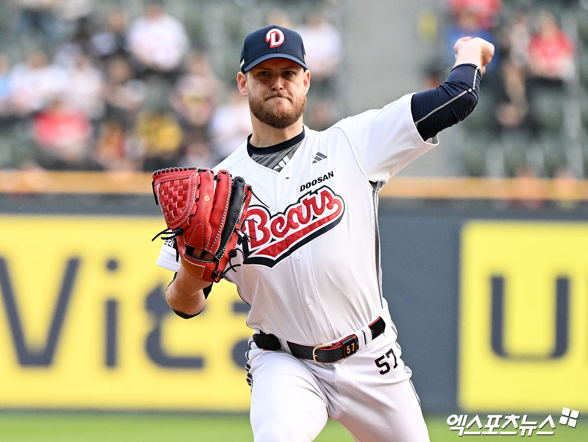 ​​​​​​​(엑스포츠뉴스 잠실, 김한준 기자) 18일 오후 서울 송파구 잠실야구장에서 열린 '2025 신한 SOL Bank KBO리그' KIA 타이거즈와 두산 베어스의 경기, 1회초 두산 선발투수 콜 어빈이 공을 힘차게 던지고 있다.
