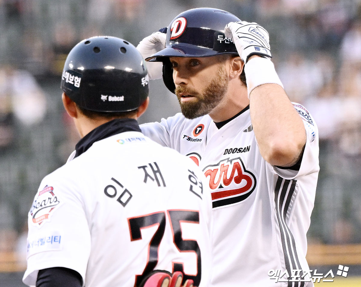 (엑스포츠뉴스 잠실, 김한준 기자) 18일 오후 서울 송파구 잠실야구장에서 열린 '2025 신한 SOL Bank KBO리그' KIA 타이거즈와 두산 베어스의 경기, 1회말 무사 1,3루 두산 케이브가 1타점 적시타를 날린 후 세리머니를 하고 있다.